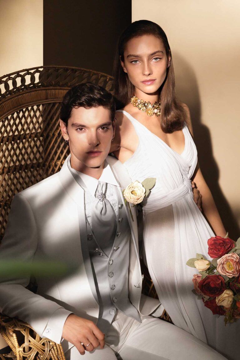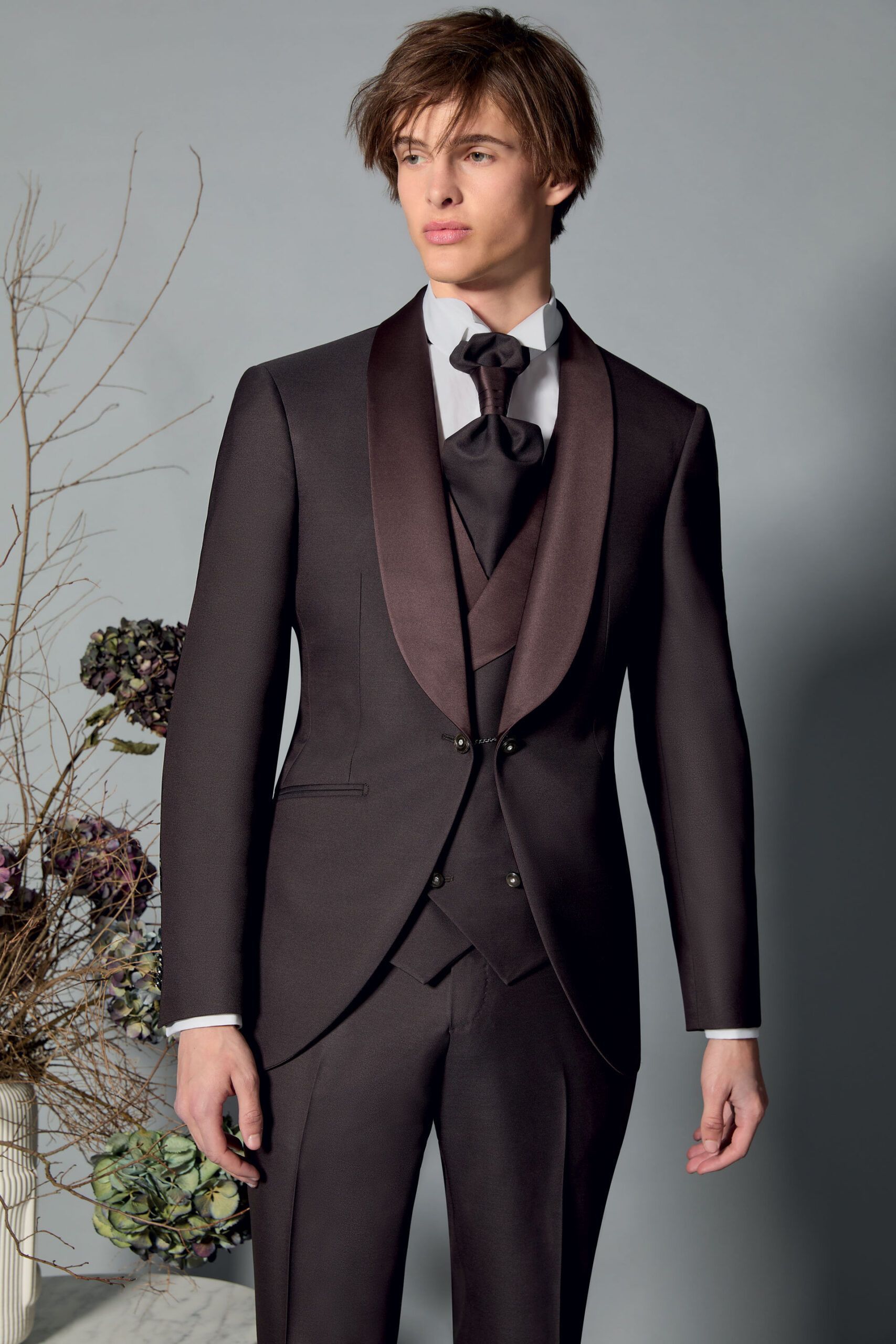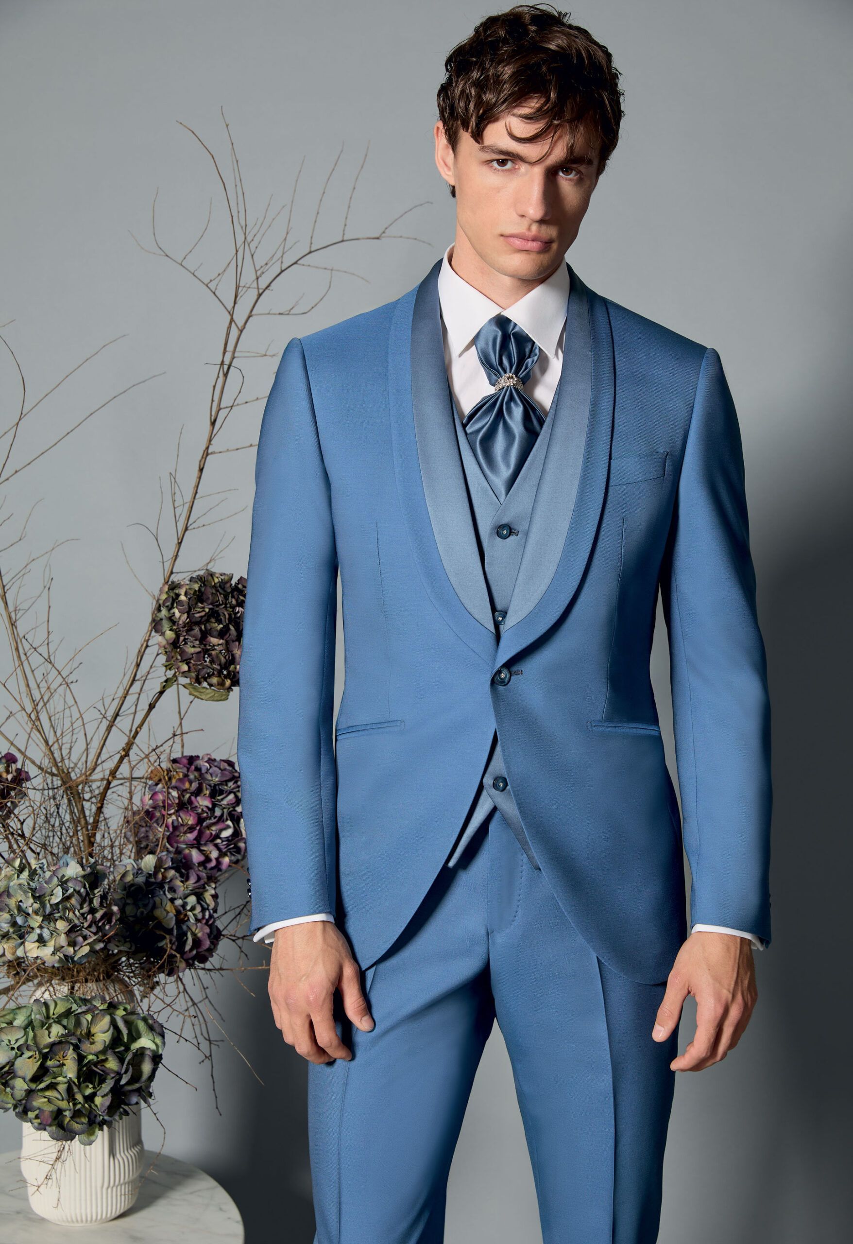 Proponiamo lo stile italiano elegante e sartoriale con tessuti particolari e pregiati per gli abiti da sposo e cerimonia